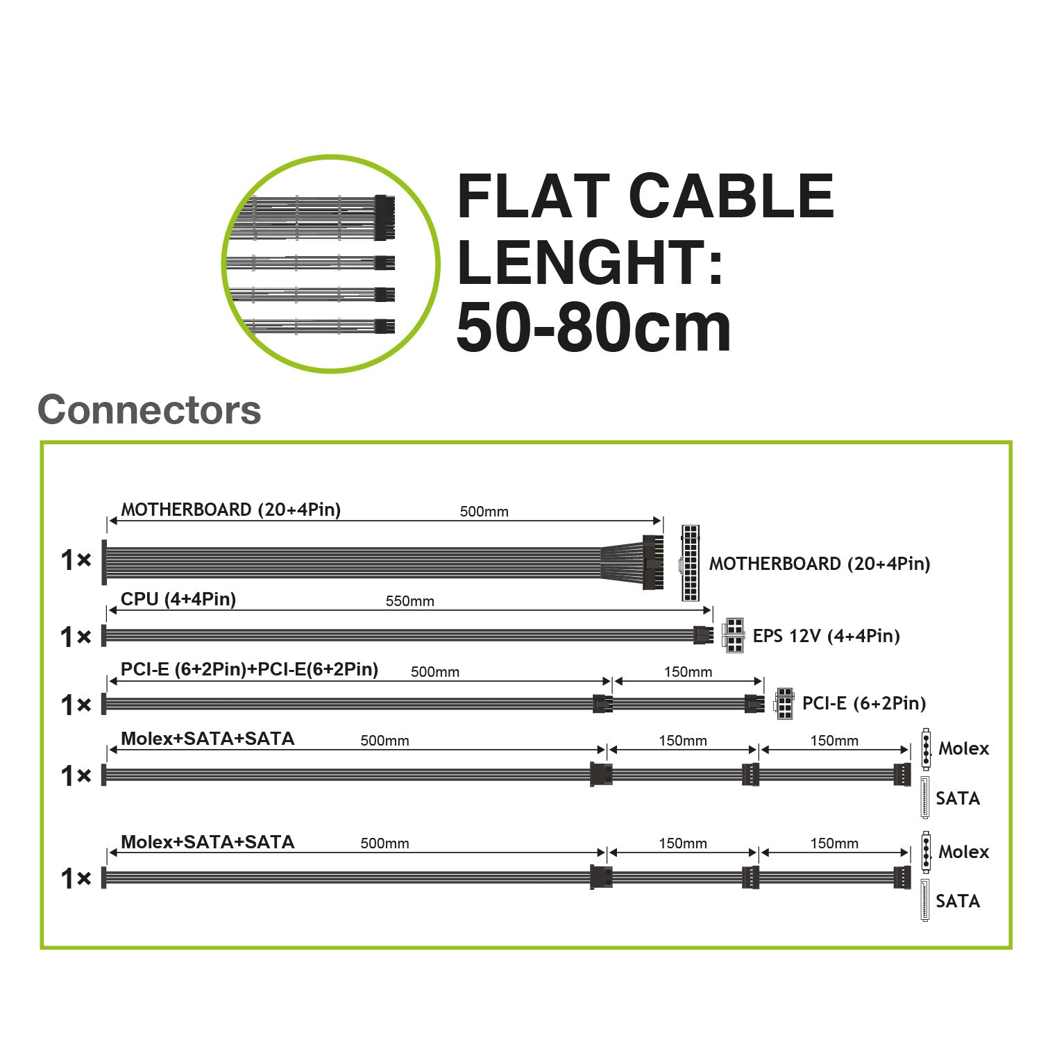 - Connettori Completi per ogni Esigenza: Dotato di 1 connettore 20+4 poli, 1 connettore 12V 4+4 poli, 2 connettori PCI-E (6+2), 4 connettori SATA e 2 Molex, per supportare una vasta gamma di componenti hardware.