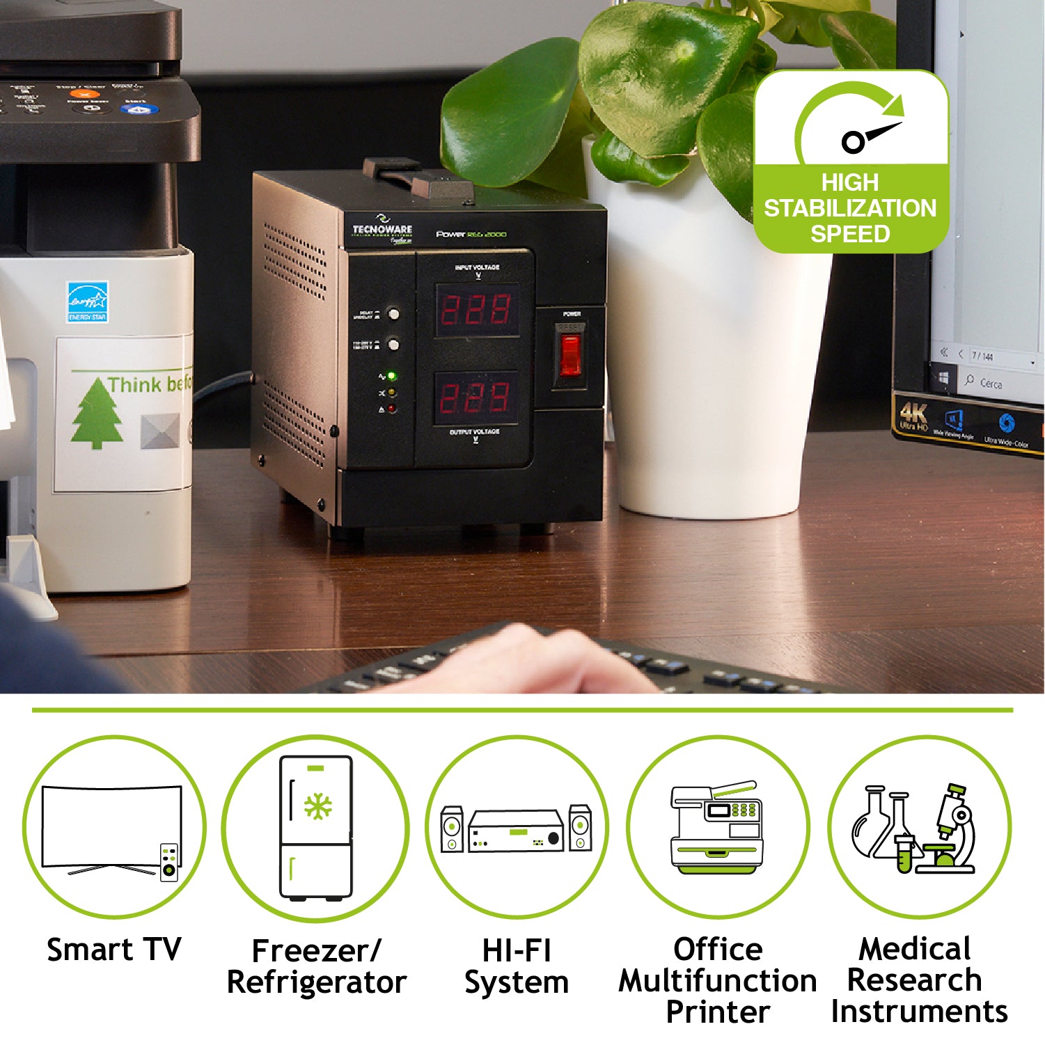 - Alimentazione stabile e sicura: Stabilizzatore da 2000 VA che protegge modem, router, PC e dispositivi elettronici da sbalzi di tensione, sovratensioni e microinterruzioni. Non è un UPS e non garantisce autonomia in caso di blackout.